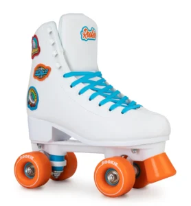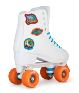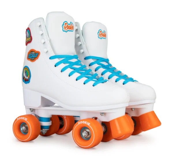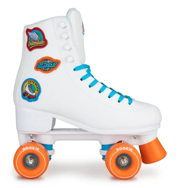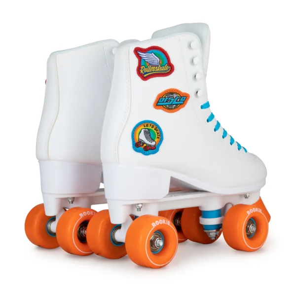 Patins de lazer versáteis para todas as superfícies. Totalmente brancos com detalhes vibrantes em azul e laranja, rodas laranjas e três stickers bordados: “Rollerskate”, “Disco” e “Let’s Skate”. Confortáveis, seguros e elegantes, perfeitos para iniciantes e experientes.