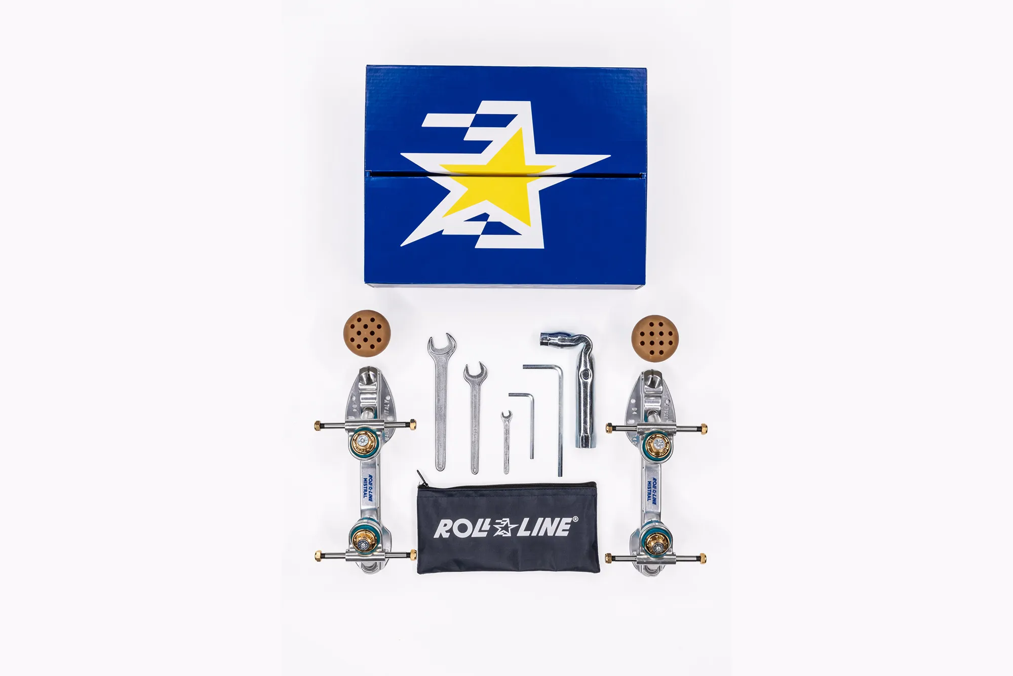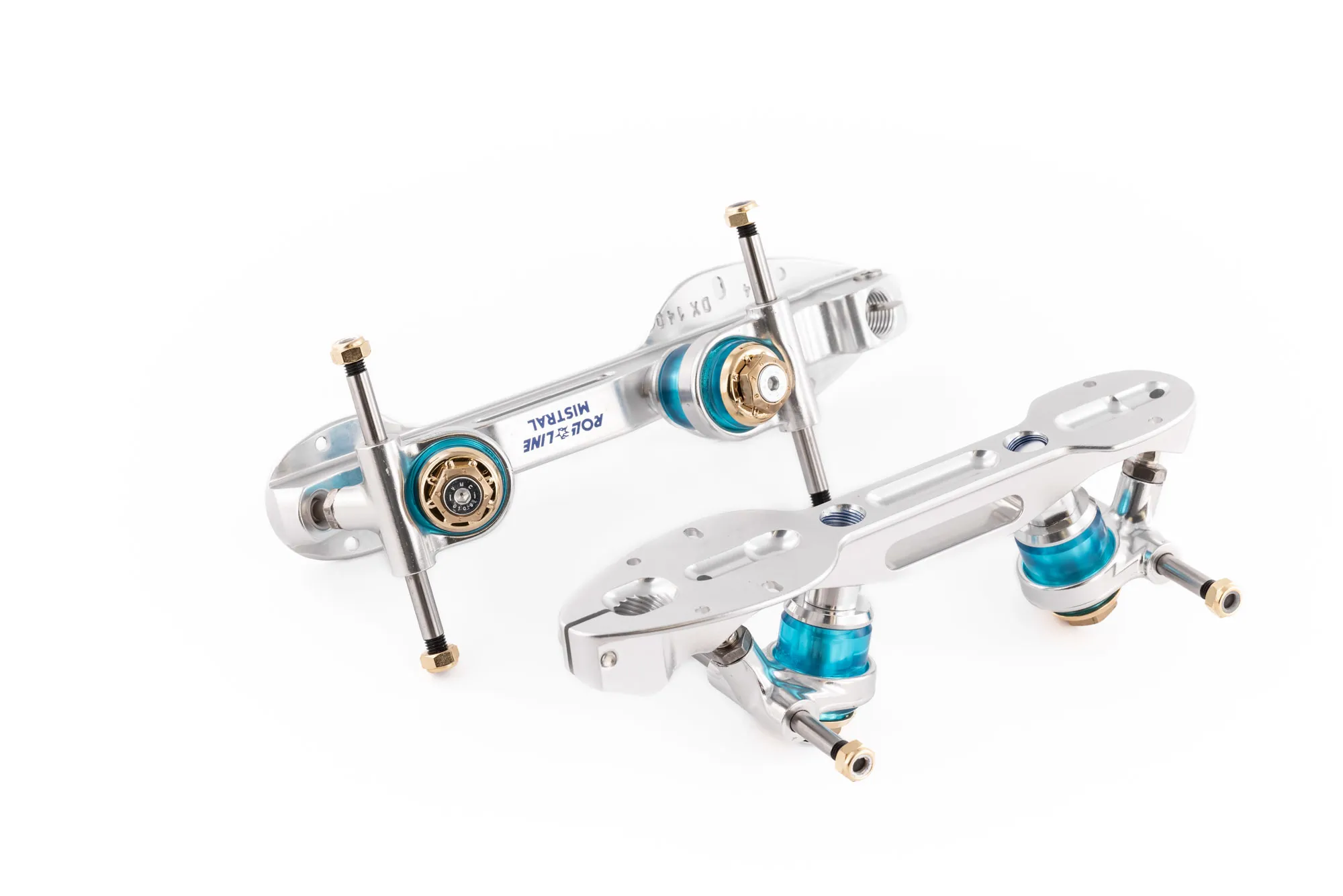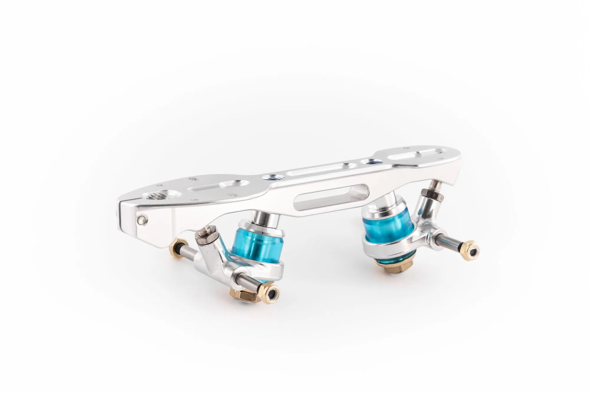 Bases de alumínio, idealizadas para a prática de patinagem artística na modalidade de livres e hóquei em patins, com design diferenciado para o pé esquerdo e direito, otimizando a execução de saltos.