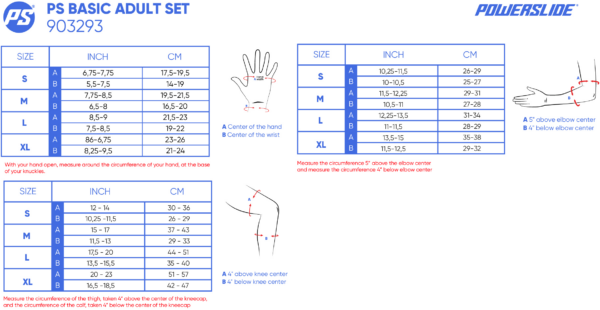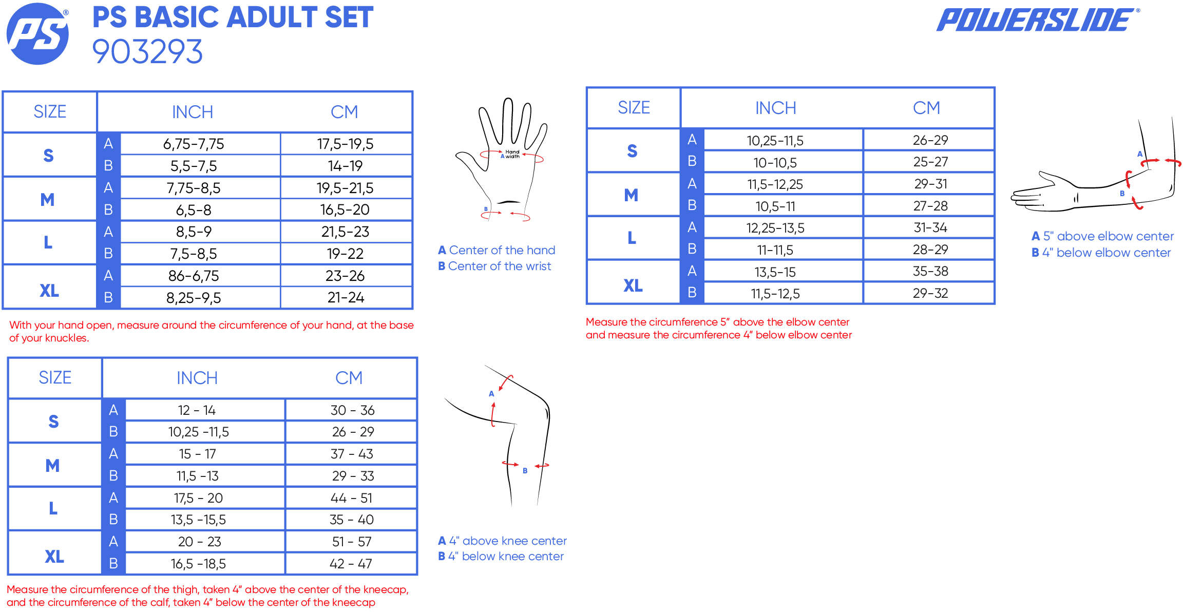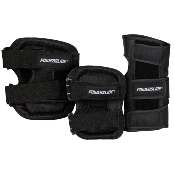 O conjunto de proteção Powerslide Basic Adult inclui joelheiras, cotoveleiras e luvas com espuma EVA, capas resistentes e talas reforçadas.