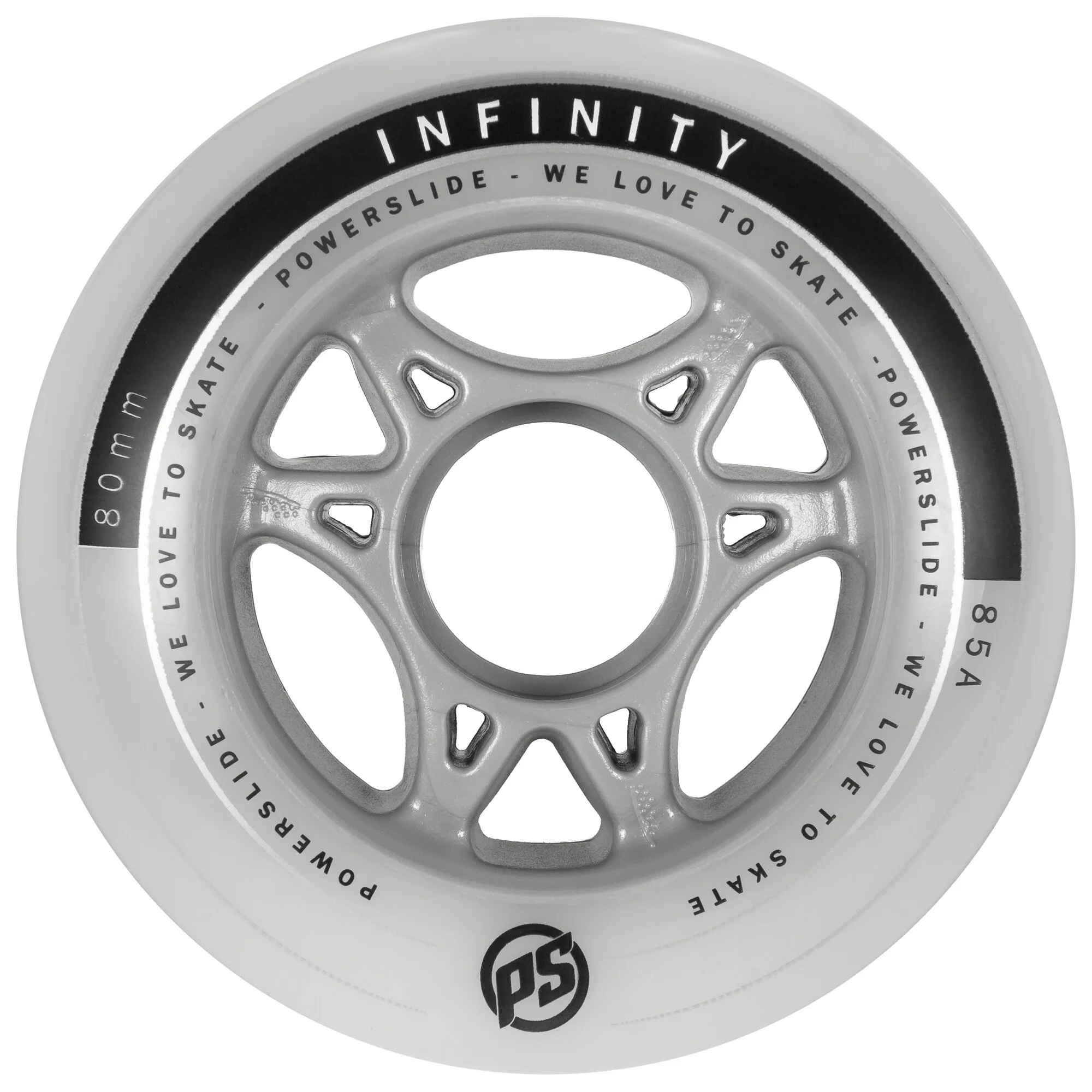 A roda Powerslide Infinity é feita com foco em treino de alto desempenho e patinagem fitness. As rodas Infinity utilizam poliuretano (PU) de qualidade Race Performance (RP) para um desempenho suave, rápido e duradouro. Uma dureza de 85A e um diâmetro de 80mm é a mistura perfeita de aderência e deslizamento. Esta roda vem numa cor cinza e está disponível em packs de 4.