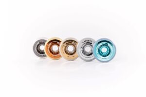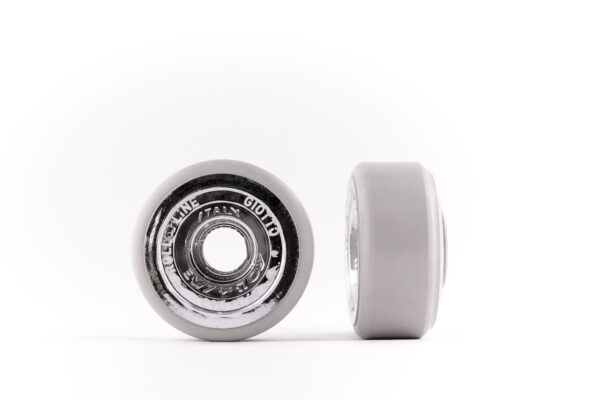 Rodas Roll-Line Giotto para patinagem artística em modalidade de obrigatórias, apresentam uma cobertura cromada elegante, projetadas para otimizar a performance.