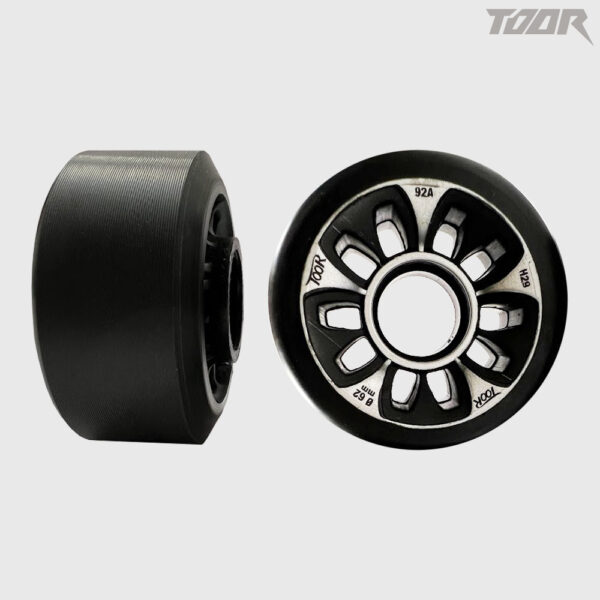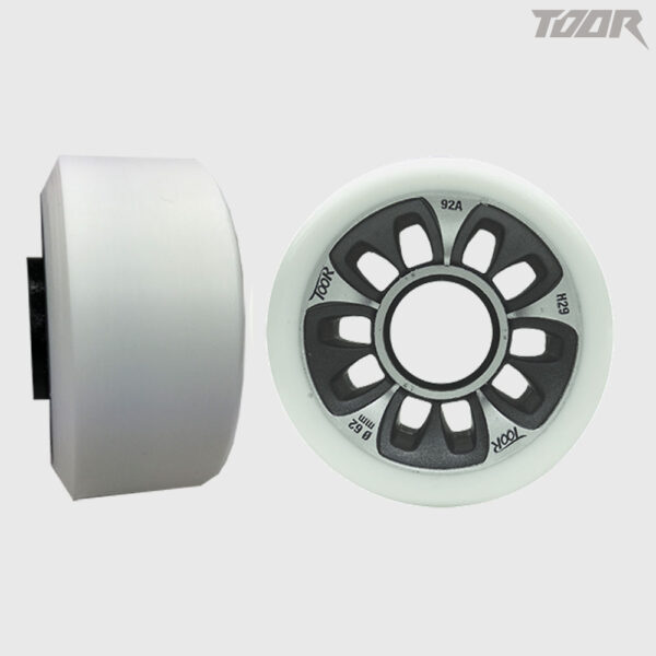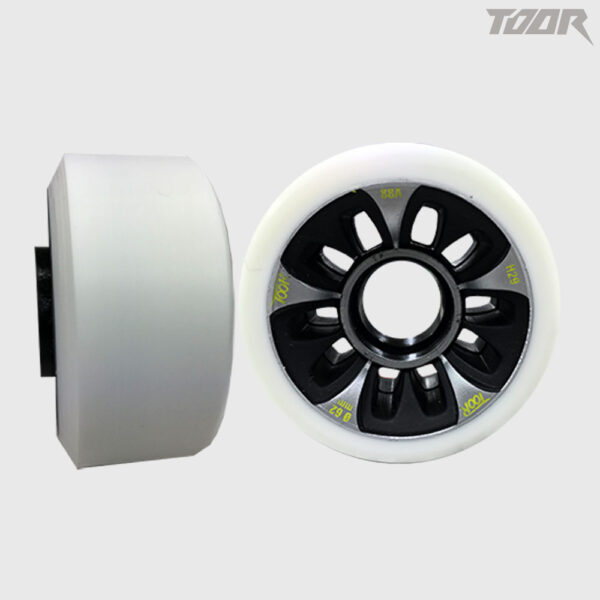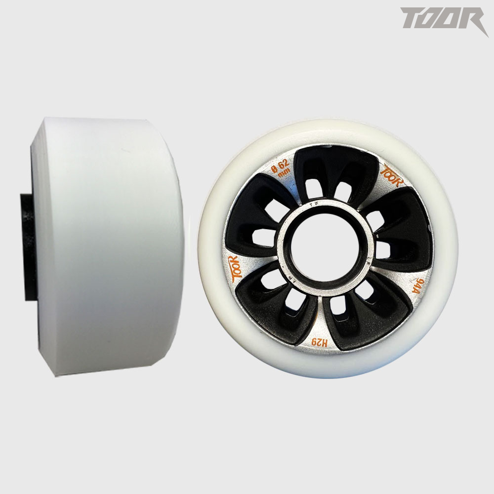 Rodas TOOR em poliuretano para hóquei em patins: adaptação perfeita ao estilo de cada atleta, disponíveis em quatro durezas. Jogo com 8 rodas. Ø 62mm.